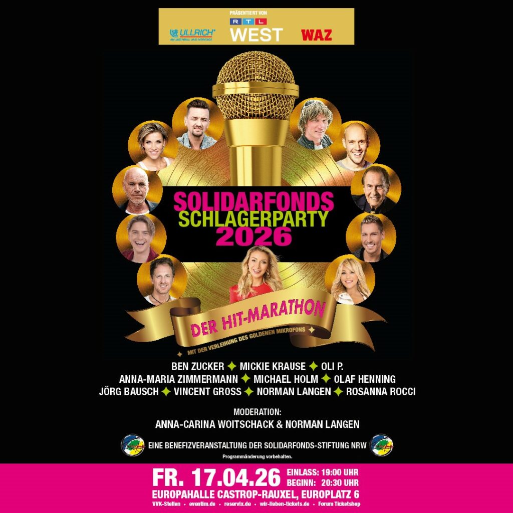 Ein absolutes Highlight für alle Schlagerfans in Nordrhein-Westfalen und darüber hinaus! Die mehr als 3000 Besucher in der stets ausverkauften Castrop-Rauxeler Europahalle sorgen zudem dafür, dass die Solidarfonds-Stiftung NRW mit ihren Bildungs-, Sport- und Sozialprojekten vielen Kindern und Jugendlichen in NRW helfen kann.
