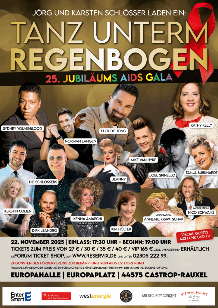 Deutschlands größte Aids-Gala „Tanz unterm Regenbogen“ findet in diesem Jahr am 25.11.23 in der Europahalle Castrop-Rauxel statt.